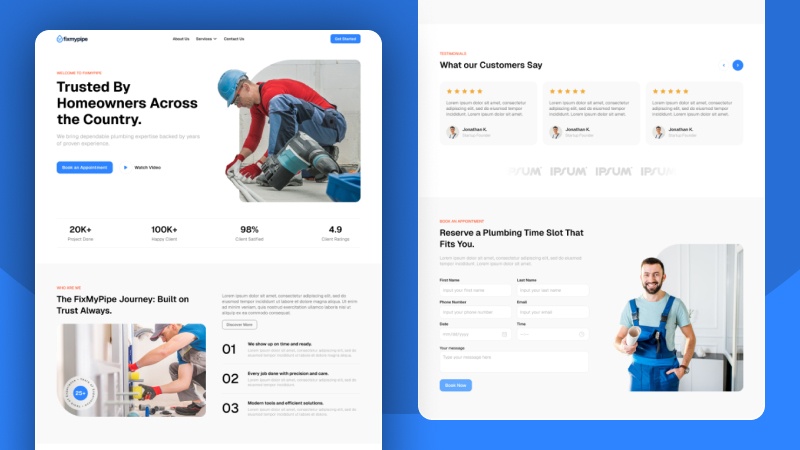 Fix My Pipe is a high-conversion website template designed specifically for the home services industry. Created for the global microstock market, this design combines a bold, trust-driven aesthetic with a highly functional layout, allowing plumbing businesses to showcase their expertise and book clients with ease.