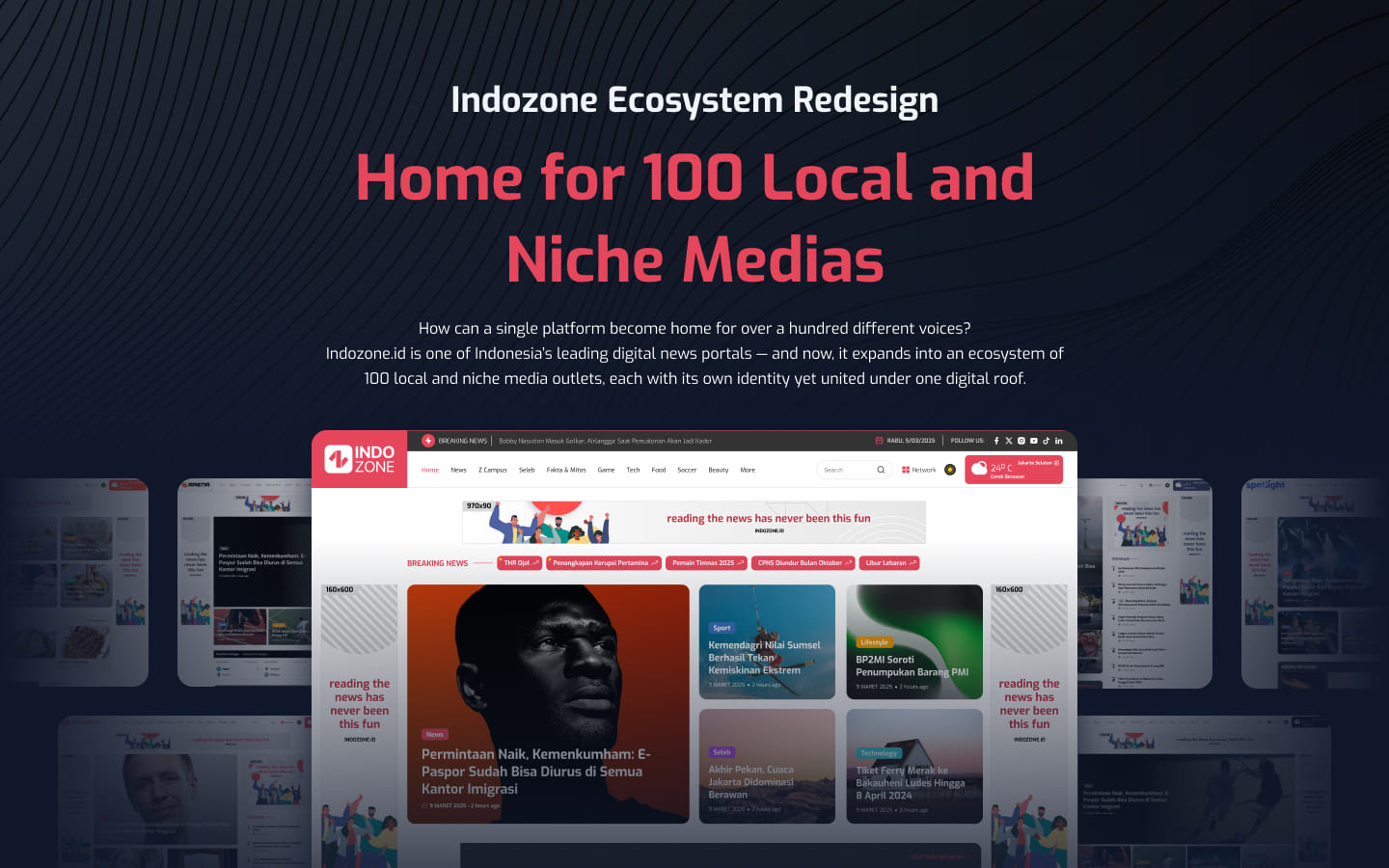 A comprehensive UI/UX overhaul for Indozone, transforming a single news portal into a powerful, scalable ecosystem that seamlessly integrates over 100 local and niche media outlets into one unified digital experience.